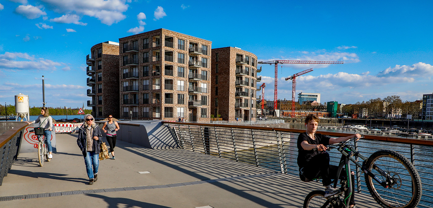 Das neue Mainzer Stadtquartier passt zur sprichwörtlichen Lebensfreude der Mainzer. Menschen sollen sich hier in erster Linie wohlfühlen. Ob ausruhen am Rhein, einen Kaffee am Hafenbecken genießen oder die Rheinwiesen zum Wohnzimmer machen – Zollhafen heisst Lebensfreude.