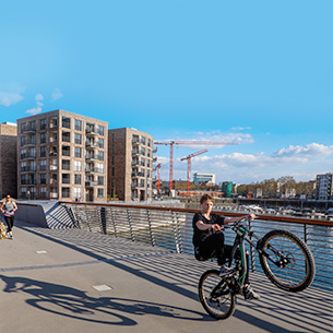 Im Zentrum liegt das 80.000 qm große Hafenbecken. Drumherum ist eine urbane Mischung aus individuell gestalteten Stadthäusern, Eigentumswohnungen und modernen Büroimmobilien gewachsen. Vielseitige Gastronomieangebote und Shoppingmöglichkeiten, zwei Kita und weitere Angebote runden das Areal ab. LOOP, die durchgängige Flaniermeile durch das Quartier, verbindet alle Stationen miteinander.